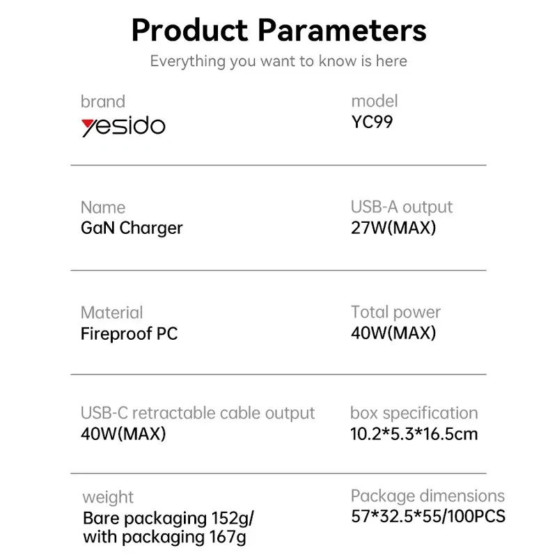 ولتاژ ورودی گستردهی 100–240 ولت باعث شده این شارژر با پریزهای برق در اکثر کشورها سازگار باشد. طراحی سبک، بدنهی جمعوجور و کابل داخلی باعث میشود YC99 همراهی عالی برای سفر، محل کار یا استفادهی خانگی باشد.