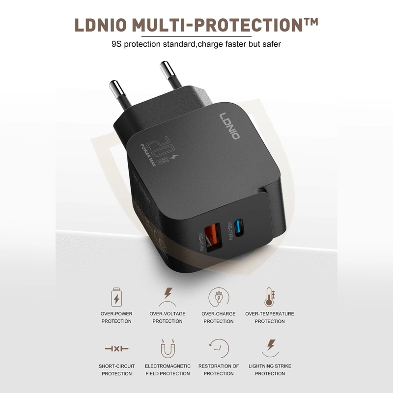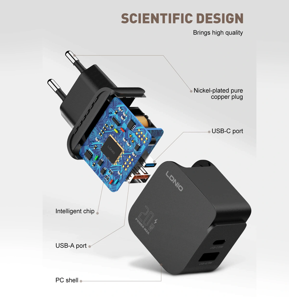 شارژر LDNIO Q1 یک آداپتور دیواری 20 واتی با پشتیبانی از فناوریهای شارژ سریع PD 3.0 و QC 3.0 است که برای کاربران امروزی با دستگاههای متنوع طراحی شده است. این مدل با داشتن دو پورت USB-C و USB-A، امکان شارژ همزمان دستگاههای مختلف را فراهم میکند و گزینهای کاربردی برای خانه، محل کار و سفر به شمار میرود.