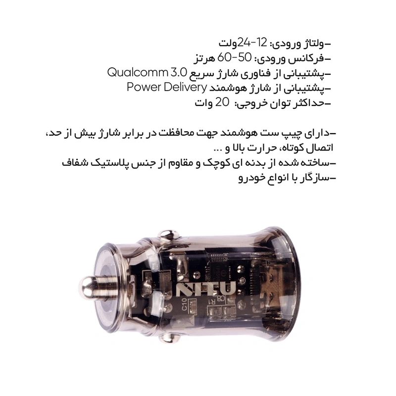 شارژر فندکی نیتو مدل NDC29 محصولی کاربردی، سبک و کم‌حجم است که با داشتن دو پورت USB و فناوری PD، شارژ سریع و ایمن را برای موبایل و تبلت شما فراهم می‌کند. طراحی شفاف آن ظاهر متفاوتی دارد و ولتاژ ورودی گسترده آن را برای انواع خودروها مناسب کرده است.