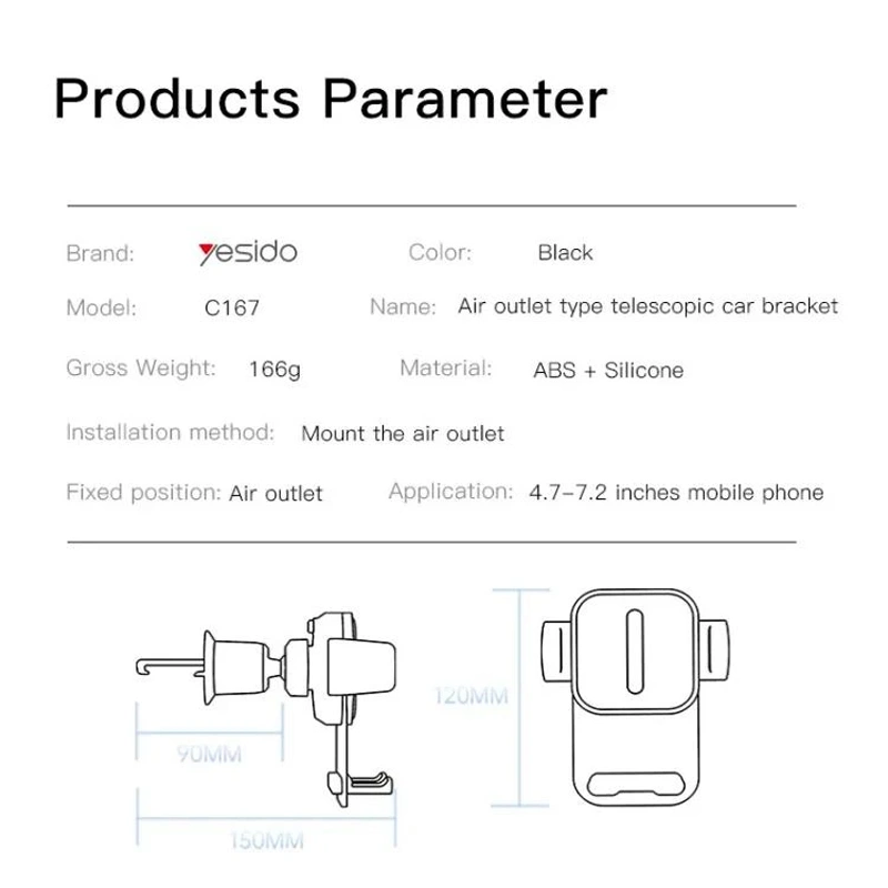 بدنه هولدر Yesido C167 از ترکیب پلاستیک فشرده ABS و سیلیکون نرم ساخته شده است. این مواد علاوهبر مقاومت بالا در برابر ضربه، گرما و فشار، یک سطح محافظ ایجاد میکنند تا گوشی خط و خش نگیرد. طراحی این مدل به گونهای است که وزن کمی دارد اما در عین حال استحکام کافی برای نگهداری گوشیهای بزرگ و سنگین را هم دارد. ابعاد محصول حدود 7×11×6.5 تا 11 سانتیمتر است که سبب میشود انواع گوشیهای 4.7 تا 7 اینچ بدون مشکل در آن قرار بگیرند.