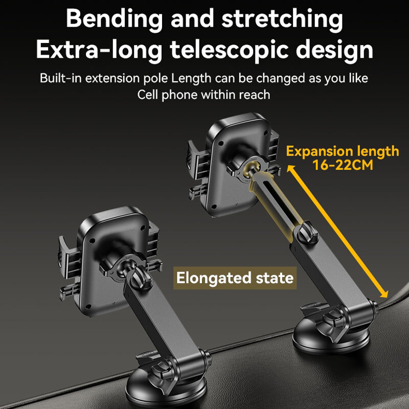 بازوی هولدر از نوع تلسکوپی است و طول آن بین ۱۶ تا ۲۲ سانتیمتر قابل تنظیم میباشد. این ویژگی به شما امکان میدهد زاویه و فاصلهی گوشی از خود را مطابق با نیازتان تنظیم کنید. مثلاً اگر میخواهید هنگام رانندگی به نقشه نگاه کنید، میتوانید بازو را جلوتر بیاورید تا دید بهتری داشته باشید.