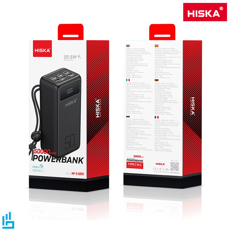 مزایا و مشخصات و ویژگی های پاوربانک هیسکا مدل HP-510PD ظرفیت 50000 میلی آمپر ساعت