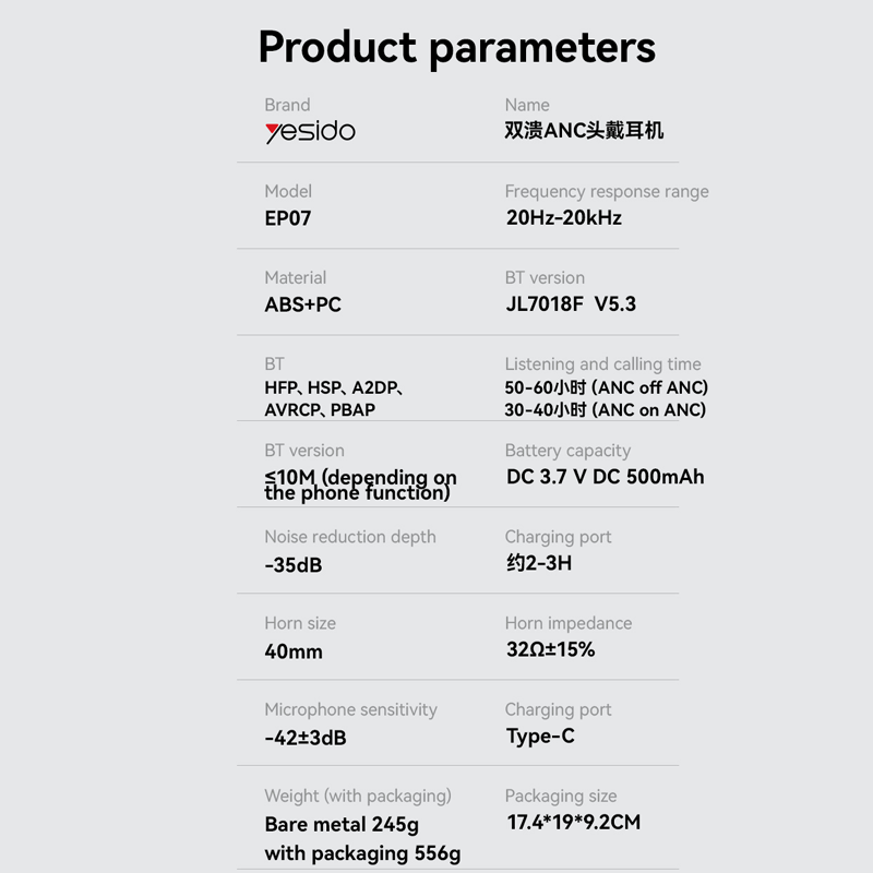 هدفون بلوتوثی یسیدو EP07 از نظر طراحی، ظاهری مدرن و کاربرپسند دارد. بدنه از پلاستیک ABS با پوشش مات و متریال PC ساخته شده که هم وزن مناسبی دارد و هم در برابر خطوخش و استفاده روزمره مقاومت خوبی نشان میدهد. طراحی ارگونومیک گوشیها باعث میشود حتی در استفادههای طولانیمدت، فشار آزاردهندهای روی گوشها احساس نشود. این موضوع EP07 را به گزینهای مناسب برای کار، مطالعه و سفر تبدیل میکند.