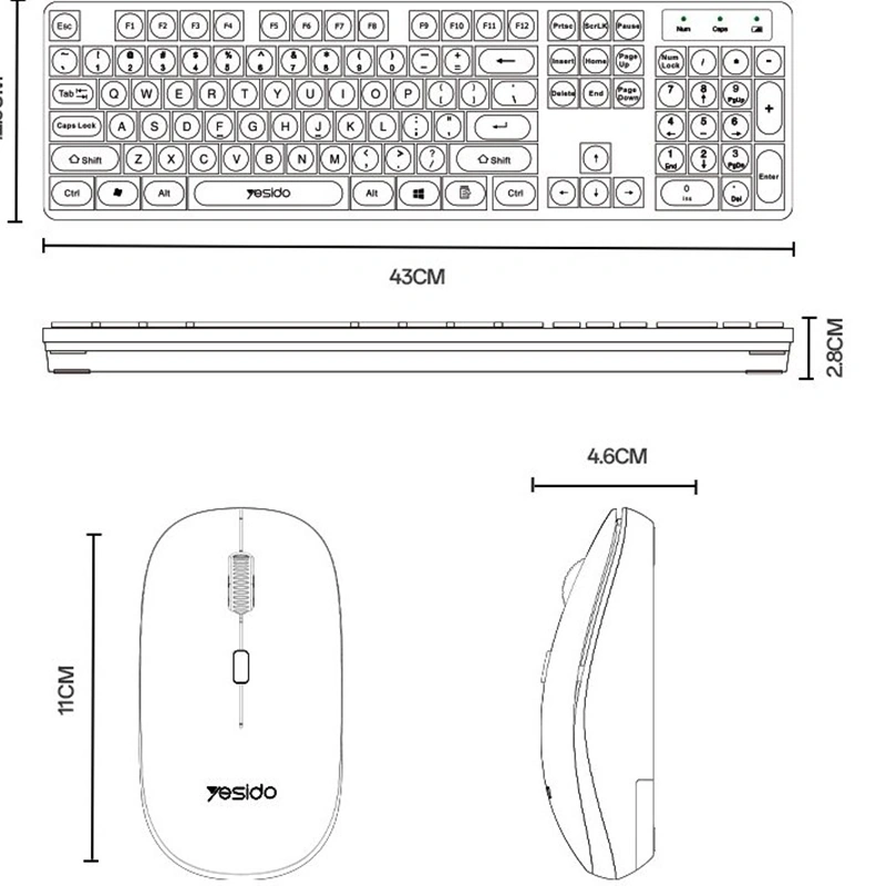 42.5 طول کیورد - 12.5 عرض کیبورد - 1.5 سانتی متر ضخامت کیبورد - طول موس 11 سانتی متر