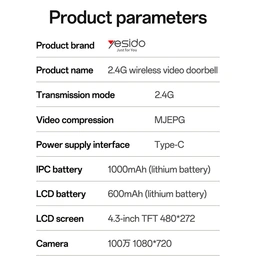 این زنگ تصویری به باتری 1000 میلیآمپری برای دوربین و 600 میلیآمپری برای مانیتور مجهز شده است. یکی از مزیتهای مهم آن، استندبای تا 6 ماه است که نیاز به شارژ مداوم را به حداقل میرساند. شارژ از طریق درگاه Type-C با ولتاژ 5 ولت و 1 آمپر انجام میشود که سریع و استاندارد است.