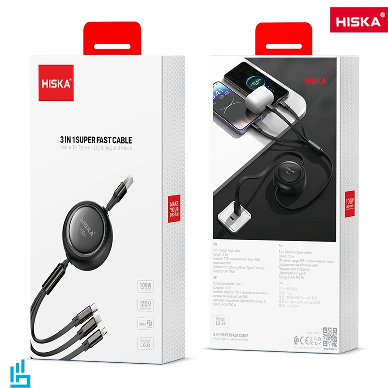 کابل هیسکا LX-34 یک انتخاب ایدهآل برای کسانی است که به دنبال یک کابل با طراحی سهکاره و سرعت شارژ بالا هستند. این کابل با ترکیب سریهای مختلف برای دستگاههای متنوع و خروجی 100 وات، راحتی و کارایی را در کنار هم ارائه میدهد. کابل هیسکا LX-34 با توجه به ویژگیهای منحصر به فرد خود، توانسته است محبوبیت زیادی پیدا کند. طراحی سهبهیک آن به شما این امکان را میدهد که تنها با یک کابل، از سه نوع اتصال مختلف استفاده کنید. این ویژگی سبب میشود که شما نیازی به چندین کابل برای دستگاههای مختلف نداشته باشید. کابل هیسکا LX-34 با طول 1.2 متر، برای استفاده در شرایط مختلف مناسب است. این کابل از سه سری مختلف تشکیل شده است: لایتنینگ، میکرو USB و USB-C، که امکان شارژ دستگاههای مختلف را با سرعت بالا فراهم میآورد. توان خروجی 100 وات این کابل، سرعت شارژ را به طرز قابل توجهی افزایش میدهد. یکی از ویژگیهای مهم این کابل سازگاری بالا با انواع دستگاهها است. چه گوشیهای آیفون با پورت لایتنینگ، چه گوشیهای اندرویدی با پورت میکرو USB یا USB-C، کابل هیسکا LX-34 قادر است به همه این دستگاهها متصل شود و به راحتی آنها را شارژ کند.