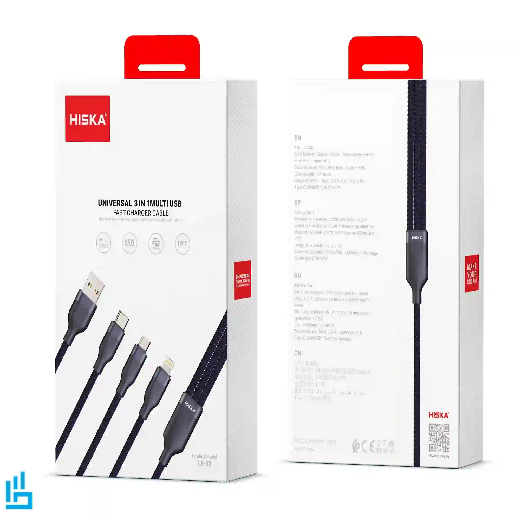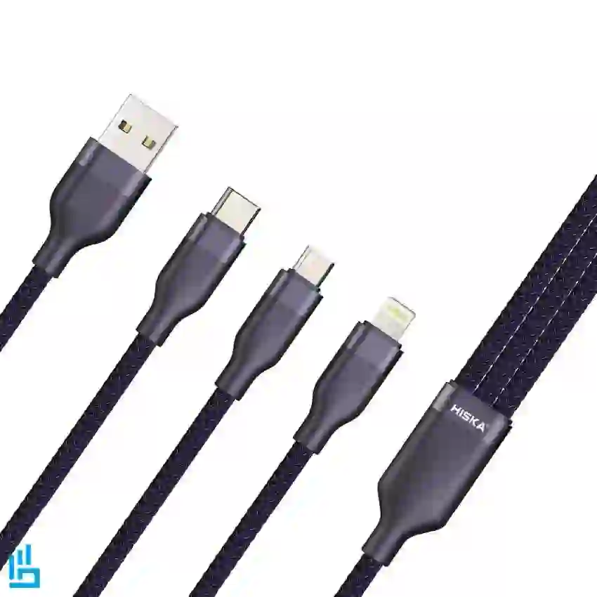 کابل شارژ سه کاره هیسکا HISKA LX32، محصولی نوآورانه و کاربردی از برند معتبر HISKA است که با هدف پاسخگویی هم‌زمان به نیاز شارژ چند نوع دستگاه طراحی شده است. این کابل با بهره‌گیری از سه کانکتور متفاوت، امکان شارژ دستگاه‌های دارای پورت لایتنینگ (اپل)، تایپ‌سی (اندروید و لپ‌تاپ‌های مدرن)، و میکرو USB را فراهم می‌سازد.