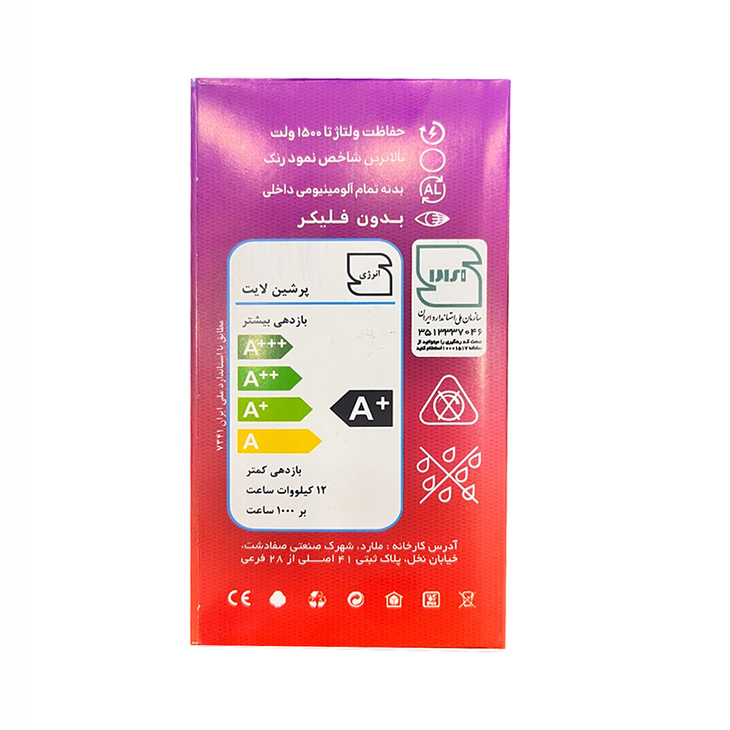 لامپ PLI پرشین لایت با ولتاژ ورودی تا 230 ولت کار میکند و دارای رده انرژی A+ است که نشاندهنده مصرف کم انرژی و صرفهجویی در برق است.