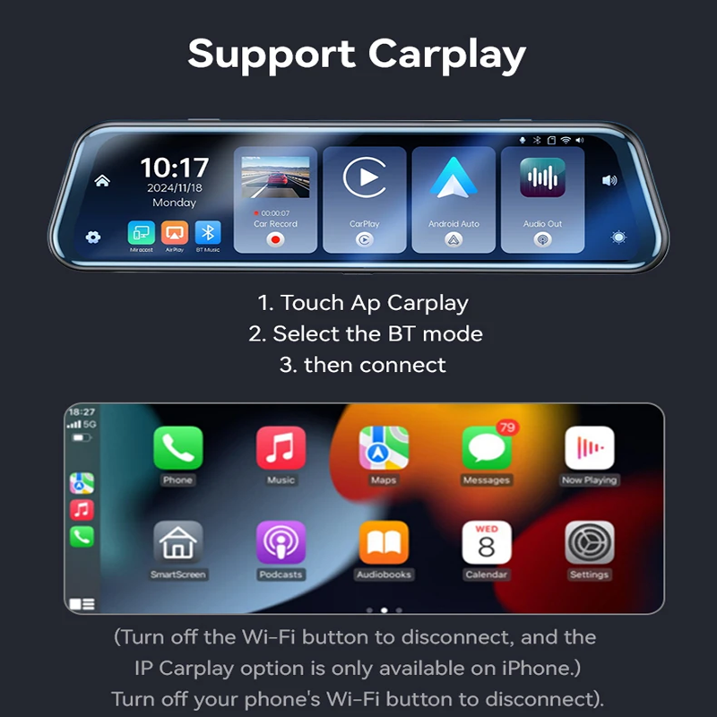 اتصال مستقیم و ساده گوشی‌های iOS و اندروید به نمایشگر دستگاه. این قابلیت‌ها به کاربر امکان دسترسی آسان به اپلیکیشن‌های ناوبری، تماس و پخش موسیقی بدون نیاز به نگاه کردن به گوشی را می‌دهد و در نتیجه ایمنی رانندگی افزایش می‌یابد.